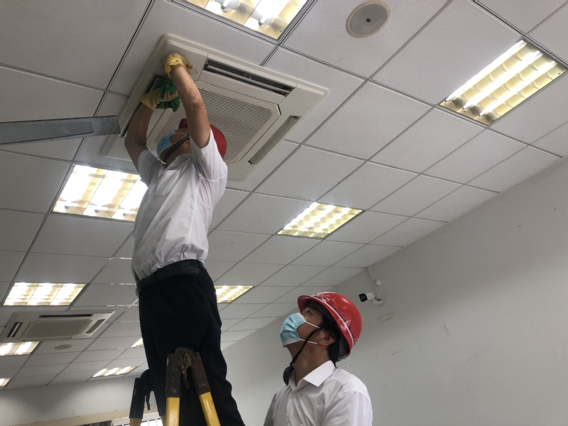 由于空调设备在使用一段时间后过滤网容易附着大量灰尘、细菌等污垢,若不及时清理维护,会直接影响人员身体健康。为有效清除空调内各类污垢,物管部安排专人,按照设备维护保养操作流程规范,在维护过程中,工作人员先将所有空调滤网拆下,用干净的抹布将内部灰尘全面擦拭,然后使用空调专用清洗剂,对滤网等配件等进行了认真清洁,待滤网晾干后再一一安装到位。