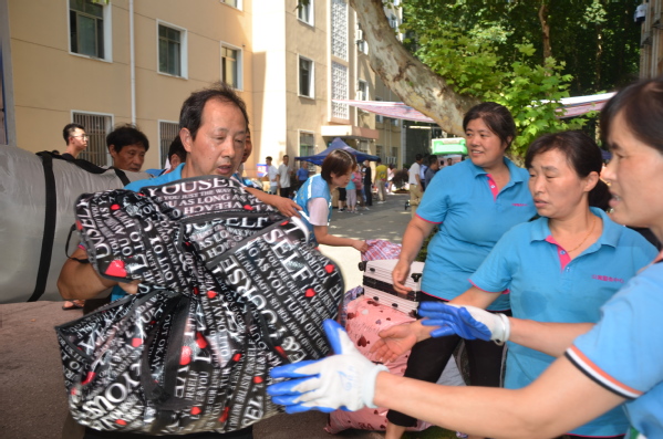 5点30分左右,第一辆装满行李的货车从将军路校区顺利到达明故宫校区。明故宫的公寓大叔、阿姨们开始帮忙卸载行李。汗水浸湿了所有人的衣衫,但没有人停下手中的工作,直到上午10:30左右,所有学生的行李全部卸载搬运完毕。随着核对信息、办理入住的手续一一完成,此次搬迁工作正式落下帷幕。