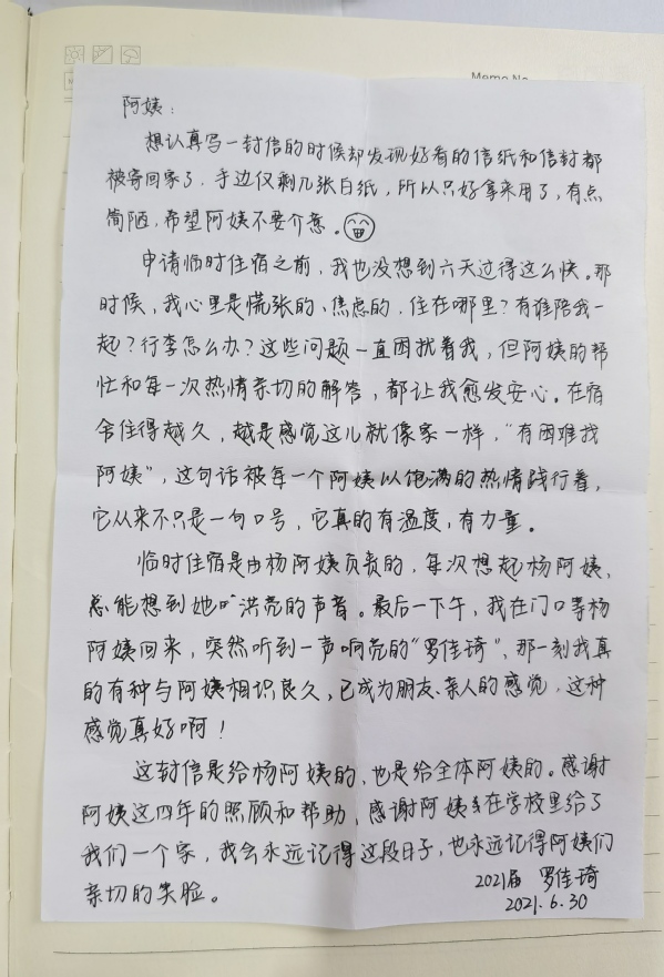 展开信纸,娟秀的字迹映入眼帘。“......感谢阿姨在学校里给了我们一个家,我会永远记得这段日子,也永远记得阿姨们亲切的笑脸。”这名学生由于一门课学分没有拿到,暂时无法离校,申请了临时宿舍。由于室友同学都已毕业离开学校,她的心里顿时有些慌张焦虑、难过沮丧。行李搬运、住宿房间都成了这个学生担心的问题,有一天路过值班室,杨忠霞热情叫住这名学生,主动与她攀谈,为她安排好宿舍还帮她搬行李,杨忠霞告诉她说:“你不要担心,还给你安排在原来的楼里,全都是认识的阿姨,有任何问题都可以找我们”。像打了一只定心剂似的,这名同学渐渐安下心来,最终完成考试拿到了学分。