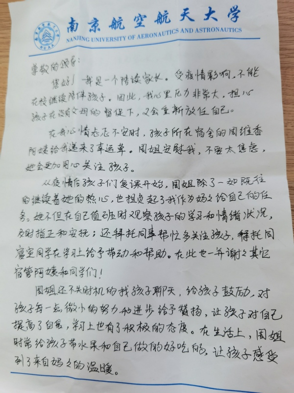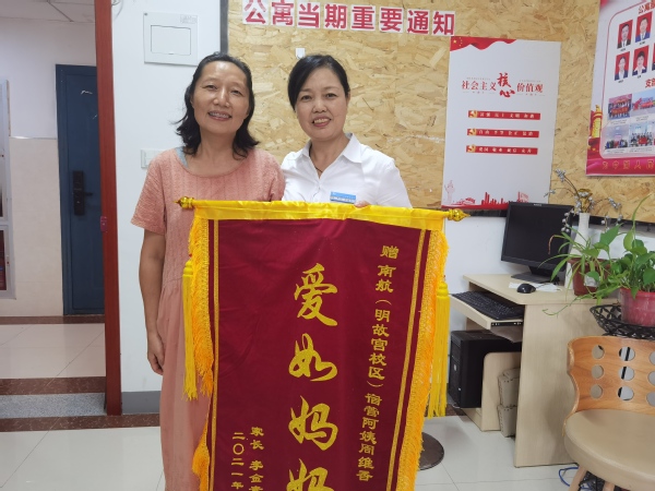 7月8日,能源与动力学院一名2016级学生的家长,将一面印有“爱如妈妈”字样的锦旗,送到了明故宫校区B9栋管理员周维香手上。“孩子现在毕业了,作为家长也不知道该怎么样感恩周姐的无私付出,特此送来一面锦旗和一封感谢信来表达我的谢意。也很感谢南航培养了这样的人心真诚的好宿管!”家长激动地说。