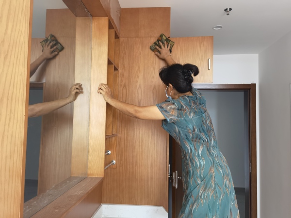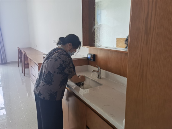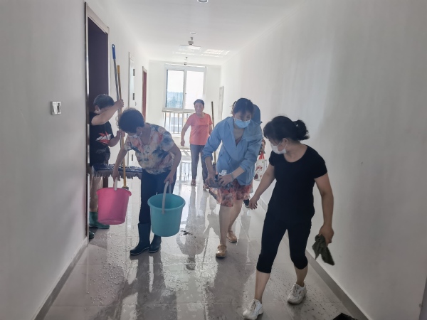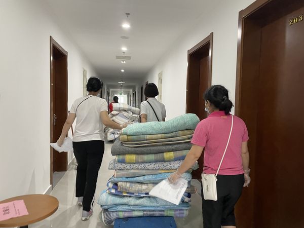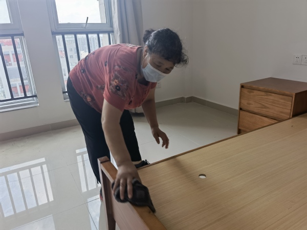 校区管委会要求当天21:00前完成所有房间的准备,以便相关学生尽早隔离。时间紧、任务重,外专楼南楼2-11层共有11层楼283间房间,当天完成,几乎是不可能完成的任务。下午14时整,公寓服务中心党支部带领50多名员工齐上阵,对南楼整栋进行全面保洁消杀、被褥铺放和防疫物资配备。7月的南京已进入伏天,天气异常闷热,毫不夸张的说在楼里稍走几步便已是大汗淋漓。员工们有序进入楼栋,一丝不苟,分工合作,逐层逐间进行保洁,运送垃圾、清扫拖地、擦拭家具、布放被褥、摆放防疫物资,检查设施设备……各司其职,尽心竭力,尘土飞扬里留下了她们忙碌的身影,汗水一次次浸湿了衣背,却没有一人抱怨、没有一人退出!晚21时整,外专楼所有房间打扫消毒完毕、所有防疫物资摆放整齐,所有标识提醒张贴到位。