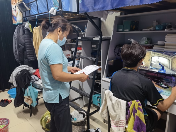 一个党支部就是一座坚强的战斗堡垒。7月21日,中心班子紧急取消休假,全部到岗到位,既当指挥、又当战斗员,将各类防疫宣传布放到每一栋公寓楼内,指引员工、留校学生去到校内指定地点进行核酸检测,针对使用老年机及不会申请苏康码的员工耐心指引,协助操作,巡视检查公寓各个点位消杀情况。