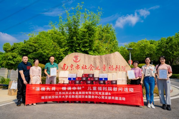 9月15日,中秋佳节来临前夕,饮食服务中心党支部联合江苏祥瑞达食品集团有限公司党支部来到南京市社会儿童福利院开展慰问活动,饮食中心党支部特别组织员工手工制作110盒鲜肉月饼,祥瑞达公司党支部也带来水果、果汁等慰问品,共同交给南京社会儿童福利院。