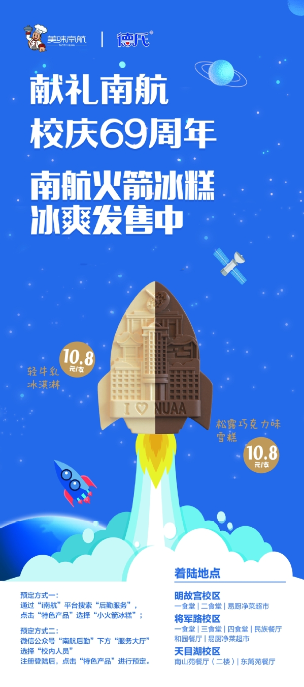 9月21日,由南航食堂定制的“小火箭”冰糕正式进驻南航食堂,为南航校庆69周年献礼。