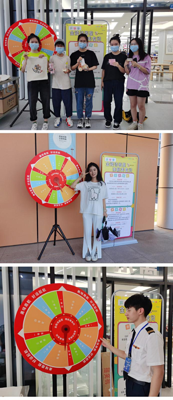 10月5日、6日中午,幸运大转盘互动游戏率先在天目湖校区南山苑餐厅和东篱苑餐厅开启,师生参与游戏即可免费赢取帆布袋、麦香杯、卡套等食堂君定制文创礼品,此外还有500份小兔子布丁以及666张迎新美食展代金券幸运好礼赠送,海量游戏礼品让同学们乐在其中,收获满满。现场同学们热情参与,拉近彼此距离,沉浸在欢乐的氛围之中。