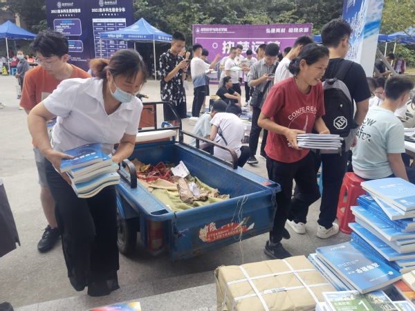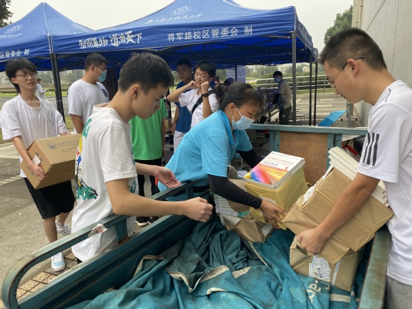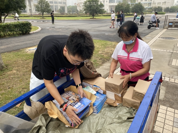 5号教学楼,同学们和公寓的阿姨大叔们一起忙着将书搬运上车;校园里的小路上,随处可见穿梭着骑三轮车运书的大叔和阿姨;公寓门口,每一栋新生公寓楼下都有公寓阿姨帮忙从车上卸书。帮忙的同时阿姨们还不忘传授着自己多年搬书运书的经验:“先核对好数量,一起装车比较快;散开的书要放在车斗的最下面,不会掉出去;车一会就到楼栋里了,先联系好卸书的同学,到了就能往下卸书;在大厅找块空地,在楼下直接把书发掉,就不用搬上6楼了……。公寓的阿姨和大叔可都是有着多年搬书运书经验的,经过他们码放的书不会散,运送的书不会少,卸下的书不会破。”