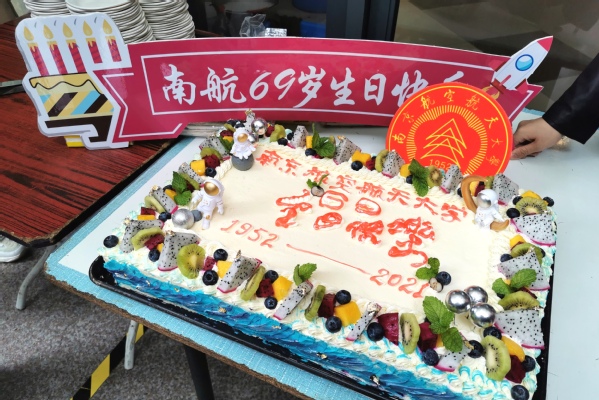 今年,校庆蛋糕由南航食堂两位西点厨师耗时3小时精心制作,为保证口感新鲜、美味,蛋糕于当天早上制作完成。校庆蛋糕由应季水果装饰点缀,搭配航空航天主题元素,表达对南航美好的愿景和祝福。
