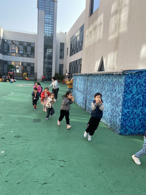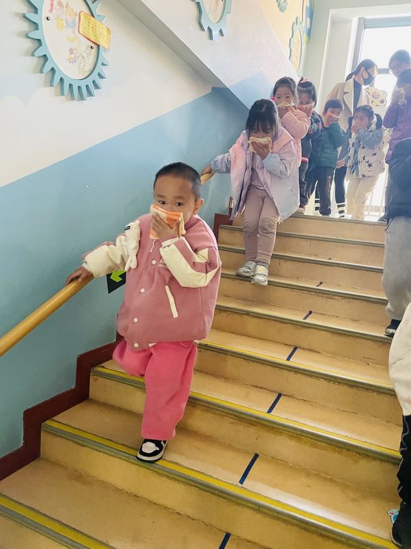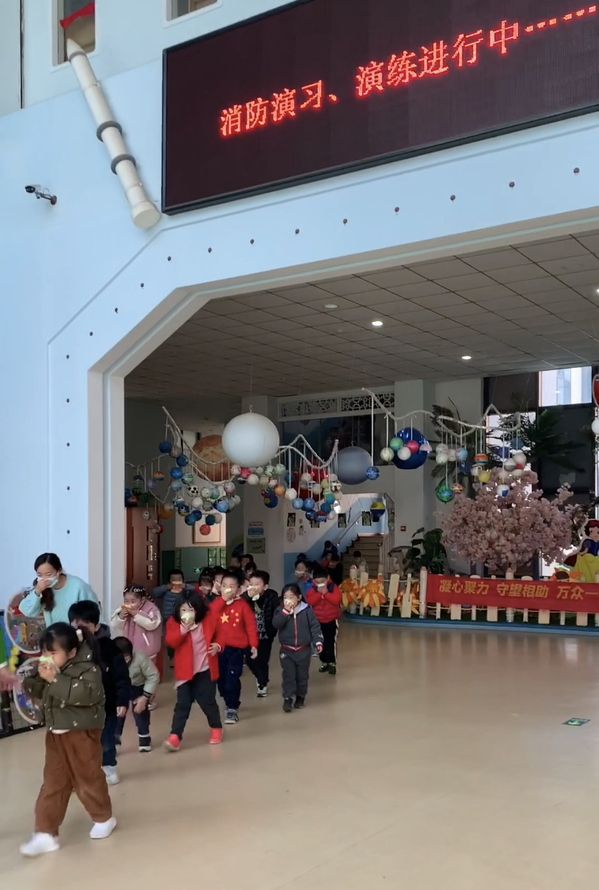 上午10:10,随着消防警报声的响起,孩子们在老师们的带领下,用湿毛巾捂住口鼻、下楼时手扶栏杆或墙壁,低头弯腰前行,不推不挤,中大班幼儿迈着快速、稳健的步伐从教学楼的各个出口、各个方向,向南操场集合,托小班幼儿虽直接从教室疏散到操场,但从他们的表情上依然可发现他们的紧张和害怕,整个演练过程用时2分26秒。到达集合点,各班级老师立即清点人数,第一时间上报本班应到、实到人数。