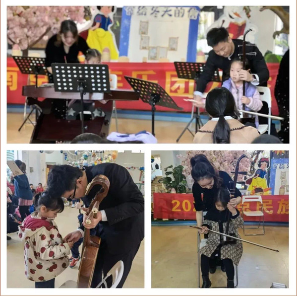 《3—6岁儿童学习与发展指南》指出:在幼儿园音乐活动的关键是萌发幼儿对美的体验,引导幼儿学会用心灵去感受和发现音乐的美,陶冶幼儿情操,促进幼儿身心健康发展。中国传统音乐的旋律和韵味,具有独特的审美价值。民乐团的叔叔阿姨带来了二胡、贝斯、笙、箜篌、扬琴、阮等民族乐器,你们知道吗?所有制作民乐器的材料都来源于大自然。一棵树的生命因为人的创造而获得了另一种延续,创造是人对自然的感恩,演奏、唱诵给大地的歌也表达了人与自然的和谐与美好。