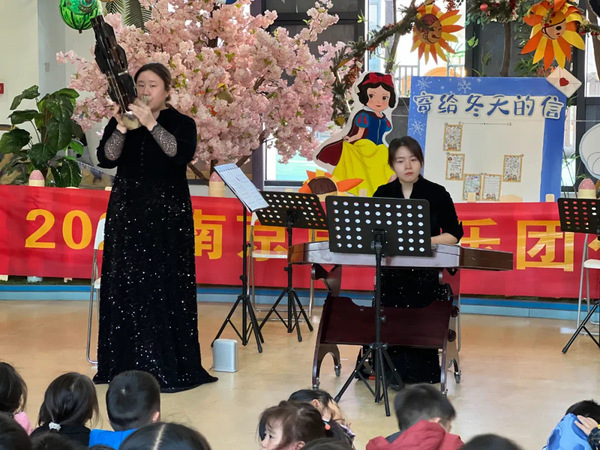 扬琴是中国常用的一种击弦乐器,扬琴的声音清脆、明亮。这首扬琴独奏《节日的天山》带来的感受,仿佛看到了新疆天山的壮丽风光和新疆人民在节日里唱歌跳舞的欢乐场面。一曲终了,我们悄悄地安排扬琴演奏家,为恰逢当天生日的两位老师奏起了《生日快乐》,全场师生一起唱响《生日快乐》,两位老师表示非常感动,感恩大家的祝福!