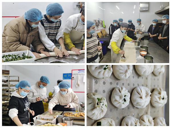 下午5点,志愿者们经过片刻休整再次集合食堂开始“厨艺课堂微课”体验,在食堂面点厨师的指导下学习制作花卷和韭菜盒子,擀面、揉面、制馅、包馅,从一窍不通的面点小白到对制作方法了然于心,这种倾注了专注和期待的体验使得每一位志愿者都欣喜不已。他们开心表示,虽然疲惫但很充实,希望下次还有机会参加这样的学习。