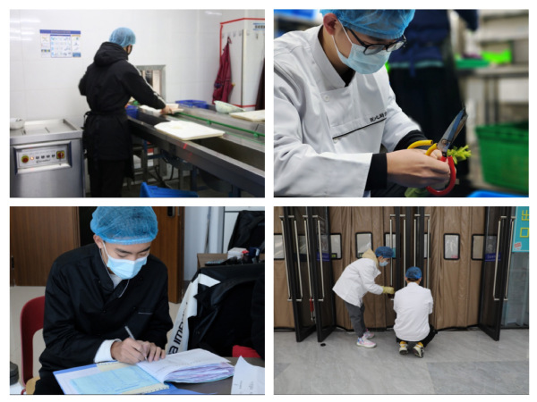 活动当天凌晨6点50,志愿者们首先按照预先岗位分配来到所在餐厅,统一佩戴工作帽和口罩,在食堂主任的带领下参观食堂后场。从加工间、烹饪间到备餐间、储藏室,食堂主任沿途介绍食堂各岗位工作要求,并细致讲解食堂原食材采购、存储、加工、烹饪整个生产流程。食堂严格的卫生环境和精细化的管理给志愿者们留下深刻印象,他们感叹:“进入食堂内部才知道,一盘菜的出炉要经过这么多道把关,食堂一丝不苟的管理,才让我们吃得如此放心。”