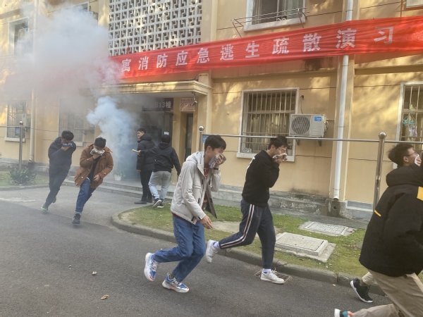 随着一阵烟雾的散发、随着一声警报的响起。明故宫校区B13幢传来“火情”,公寓管理员收到“火情”报警,第一时间打开所有消防通道门,拨打校园报警电话,迅速引导学生从安全通道撤离。
