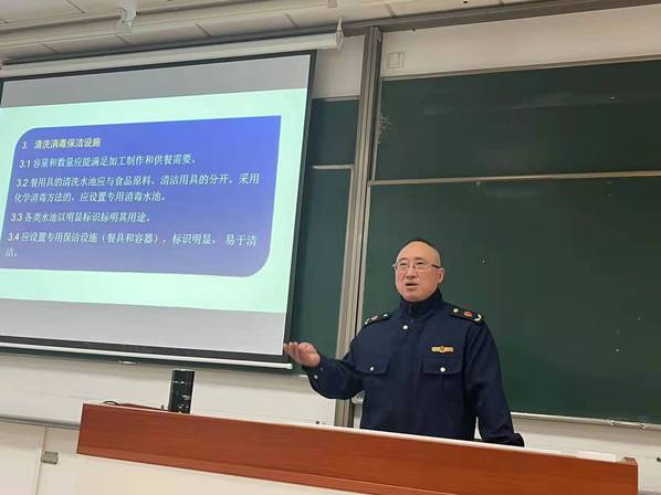 为切实做好食品安全管理工作,进一步提升员工的食品安全意识,保障师生身体健康和饮食安全,12月16日下午,饮食服务中心邀请南京市江宁区市场监督管理局任有海局长于将军路校区组织开展食品安全专项培训。后勤集团副总经理颜萌、饮食服务中心主任陈杰出席指导,将军路校区员工近150余人参加了培训。