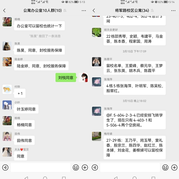 疫情就是命令,防控就是责任,3月20日晚,中心班子召开紧急会议,落实校内保障方案,聚焦疫情防控各项工作要求,落细落实系列防疫保障。“6-7-12-13-14值班员潘彤、陶安香、杨素琴,管理员陈李民、何林丽、孙利利愿意留在学校上班”、“25-26栋杨忠霞,王枚,张任兰,牛家霞,共4人愿意在校工作不回家”......学校封闭管理前,公寓服务中心员工积极报名,参与留校保障工作,没有一点犹豫。157名员工按要求全部在规定时间内到岗,即将值班下班的员工换洗衣物都没来得及拿,就让家人送过来。大家各司其职、迅速行动,大力秉持抗疫精神,展现责任担当,为学校打赢防控阻击战提供坚实后勤保障。