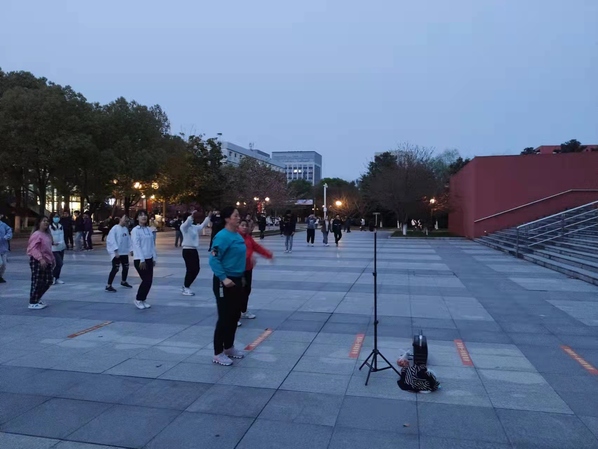 3月27日晚18:30,东区体育馆门口广场上,一曲又一曲富有节奏感的音乐响起,公寓管理员袁晓珍带着一众留校保障的公寓员工在空旷的场地跳起健身操,音乐欢快、身姿轻盈,跳出了好心情、跳出了精气神儿,更是跳出了大家抗击疫情时积极乐观的心态。阿姨们的舞蹈引起不少路过的学生驻足观看,有的掏出手机拍照记录下阿姨们的舞蹈瞬间,有的拉着室友、同学一起加入到舞蹈中来,还有的高举手机当作灯牌,场面十分热闹。阿姨们也和学生互动,邀请学生一同健身,夜幕降临,华灯初上,踏着青春的节拍,谱写动听的旋律,现场从阿姨到学生,一起跟随音乐尽情舞蹈,施展身姿,将白天的疲惫一扫而尽,充分展现南航人乐观开朗、健康向上的精神面貌!