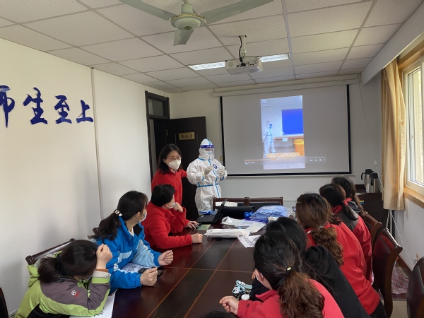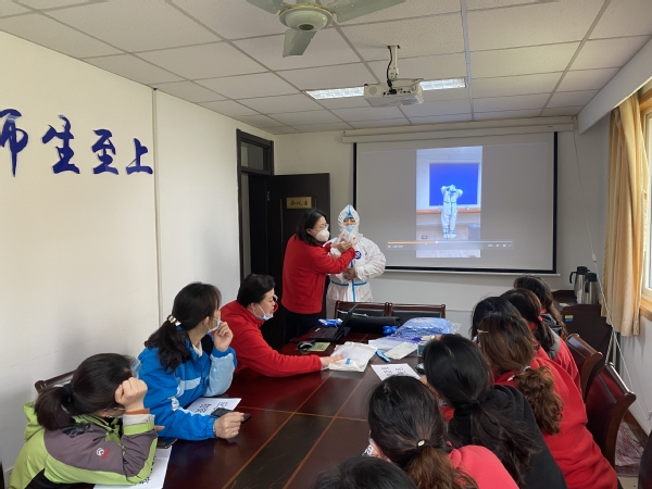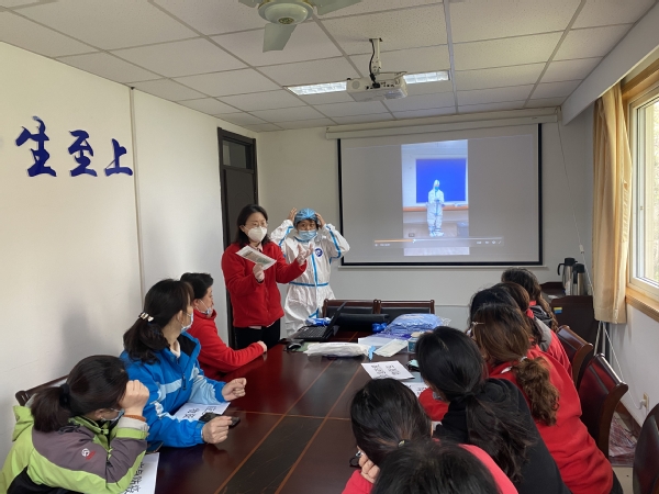 9:00,中心对管理员团队进行了“穿脱防护服”的操作培训,通过视频授课与现场操作示范相结合的方式,详细讲解了“穿脱防护服”的用物准备、洗手步骤、穿脱步骤、注意事项、防护及消毒处理步骤等具体细节。在理论知识讲解结束后,管理员罗银花进行了现场“穿脱防护服”步骤的示范,全体管理员、青年骨干认真观看演示,公寓服务中心副主任杨楠对每个穿脱步骤都进行了的点评与细节指导,管理员们一同互动,指出在穿脱防护服时容易出现的问题。