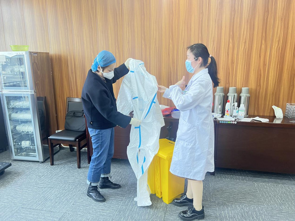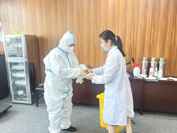 培训后,就如何在干净无污染的环境中穿防护服进行正确示范,从戴头套、戴手套、穿防护服、穿鞋套、戴面罩等一系列流程。尤其是在完成各项工作后,脱防护服时更要特别注意安全。