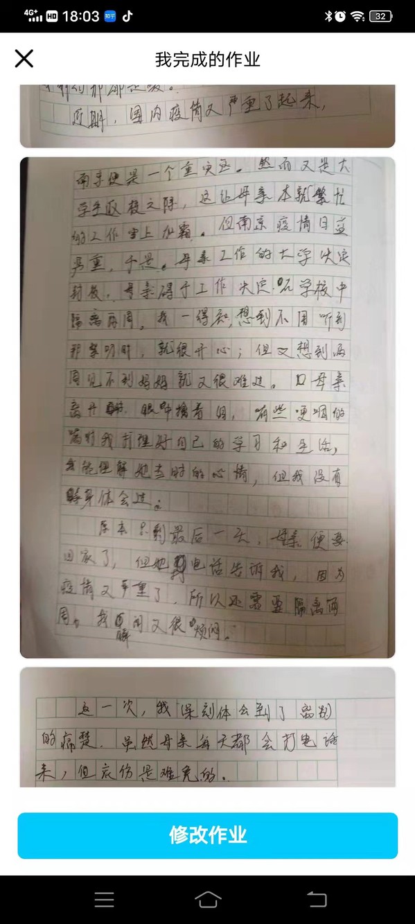 “......母亲离开家时眼中噙着泪,有些哽咽的嘱咐我打理好自己的学习和生活,这一次我体会到了离别的痛苦,别的同学都有家长陪着,可是我的妈妈却不在我身边......”看着儿子的作文,施珍香不禁红了眼眶,对儿子的思念之情如潮水般涌上心头。孩子的语言,情真意切,让人泪目。孩子有没有认真学习?出门戴好口罩了没有?爷爷奶奶做的菜孩子能不能吃得惯?丈夫有没有按时督促孩子上网课?种种担忧藏在施珍香心中,然而白天忙起来根本无睱顾及,只能在深夜通过电话、视频和丈夫儿子彼此问好,嘱咐儿子好好学习。