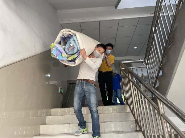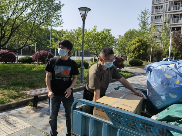 由于疫情管控升级,今年两校区不再在各毕业生楼栋外设置行李托运点,为免去楼里同学远距离搬运行李,中心连续多日安排人员骑电动车往返研究生楼栋、快递点和校门口,全力帮助毕业生运送行李。由于毕业学生数量大,距离远、物品多、行李重,在保证其他楼栋日常工作的基础上,公寓中心两校区安排三轮车,从早7点半开始便等候在楼栋门前,员工们和学生一起,或两两配合,互相协作,或直接行李扛在肩膀上,一件件搬到三轮车上,一次次穿梭于楼栋和快递点之间。电动车没电了,很快就有另一位员工带车来支援,无论是烈日炎炎还是风雨交加,只要学生需要,员工们就立即出动协助毕业生搬运,帮助他们顺利寄送物品或是离校。