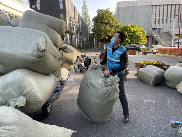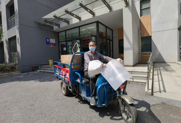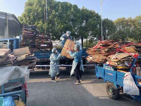 封闭管理不代表成为“孤岛”,为解决一线保洁员废品回收问题,防止纸盒、衣物等废品长期堆积在校内,公寓服务中心积极联系校外废品回收人员,确定相关人员进校的时间地点,并严格按照防疫要求进行操作。提前查验废品回收人员进校前的行程码、苏康码、24小时内核酸报告;回收过程中,公寓办公室安排专人现场协调和监督,所有对接人员按要求做好防护消杀、全程遵循指定路线,保证安全的前提下解决了保洁员的燃眉之急。