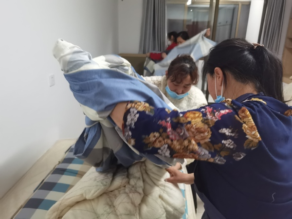 4月9日,学校加强疫情防控措施,升级校园封闭管理,公寓服务中心承担住宿员工的服务保障工作,接到指令,中心积极响应,高效执行,迅速对明故宫校区B4栋、青年教工公寓、将军路校区怡园19栋、慧园1栋的空置房间进行全面保洁、铺放被褥。已经住校20天的公寓人能出动得都参与到这项紧锣密鼓的任务中,有人认真核算统筹两校区的空宿舍资源,制定住宿安排方案;有人检查设施设备,联系维修人员进行报修;有人肩扛手提,搬运来一套套新订购的被褥;有人对房间进行细致保洁,开窗通风,喷洒消毒……尘土飞扬中留下了他们忙碌的身影。四月的南京,夜深了,夜晚的微风透着一丝清凉,汗水却浸透了公寓人的衣衫。23:30,经过5个多小时马不停歇的劳作,几十间宿舍全部打扫完毕、床上整齐铺放好崭新的被褥、桌面上摆放好《致老师的一封信》。住校保障老师的临时宿舍准备就绪,静待各位老师入住。封闭管理之下,公寓服务中心为学校运行保驾护航,为疫情防控工作增加一道坚实防线。