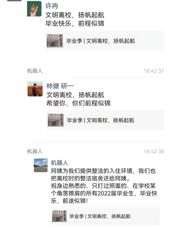 “很多硕士毕业生离校前都特意来和我们打招呼,道一声再见,感谢我们的辛勤劳动。其实我们做的事情微不足道,但他们都记在心里,说实在的,特别感动。”和园区公寓管理员施珍香说。