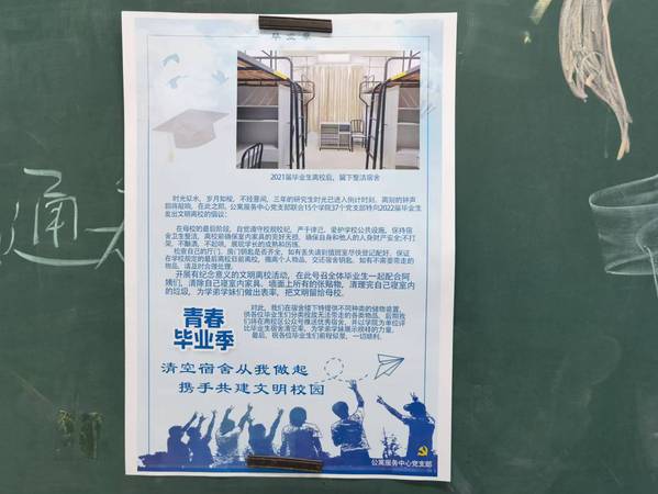 疫情之下,为全方位助力研究生毕业文明离校工作,营造健康有序、生动活泼的毕业氛围,公寓服务中心党支部联合两校区16个学院37个支部开展以“文明离校,扬帆远航”为主题的2022年毕业季活动,积极搭建线上线下系列主题鲜明的毕业季教育活动,引导毕业生响应号召。中心党支部在毕业生公寓楼门厅张贴《文明离校》宣传海报,倡议文明退宿离校,联合学生权益事务服务部在微信公众号推送文明离校活动倡议书,邀请各支部转发学生微信群、QQ群、朋友圈进行大力宣传,支部党员们深入毕业生宿舍,提醒大家随手关门,清除自己寝室内家具、墙面上所有的张贴物,清空宿舍,为学弟学妹们做出表率,把文明留给母校。充分展现毕业生有理想、有追求、有担当、有作为、有品质、有修养的精神风貌。公寓阿姨们告知毕业生们如何办理离校手续、暂缓离校手续和其他注意事项,让毕业生感受到来自公寓的关怀与期盼。