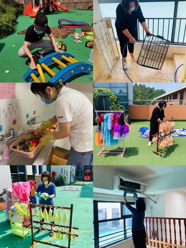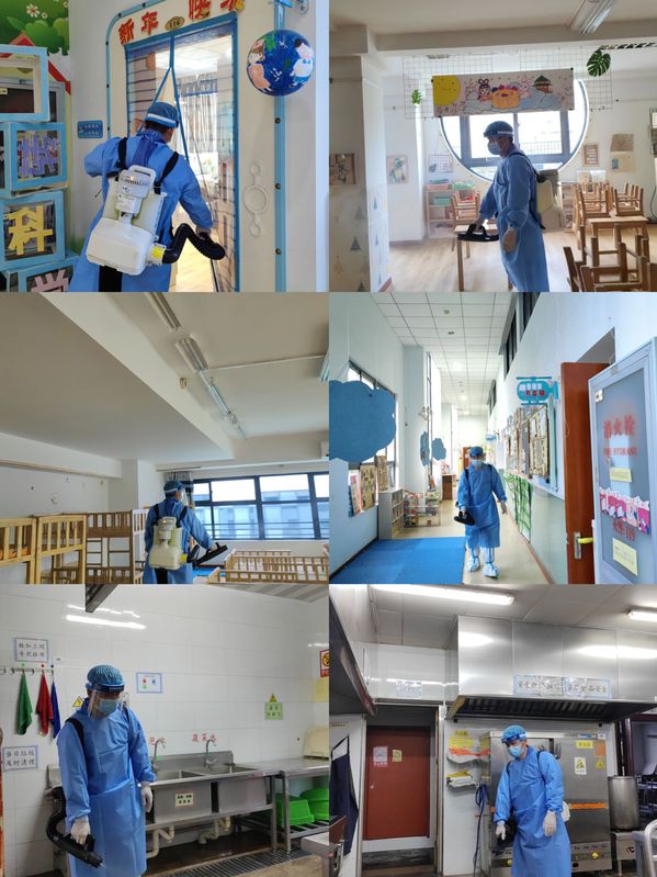 为保证返园复学的安全、稳定和有序开展,根据江宁区教育局疫情防控要求,在园长李民惠的带领下,召开园委扩大会,讨论返园复学各项准备工作,在全体教工的积极努力下,我园顺利通过区教育局返校复学疫情防控检查。保健室组织疫情防控培训,责任分工到人,全园清洗消毒,同时教师们对幼儿园户外游戏器械、班级桌椅、盥洗室、寝室、教玩具……进行全面的清洗消毒,邀请专业机构对全园进行无死角消毒消杀,为孩子们筑起一道坚实有效的安全防护网。