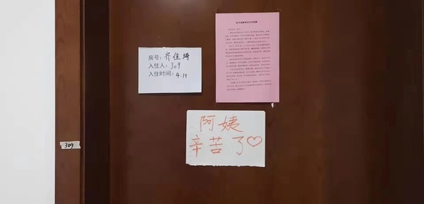 一句离开时的谢谢阿姨,一张认真书写着“辛苦了,谢谢你们”的字条……鼓励和感动着服务于外专楼的公寓员工们。世界上没有从天而将的英雄,只有挺身而出的凡人。外专楼医学观察点的工作是在重复、枯燥甚至有一定风险的封闭空间里,李照英与公寓同事们一起始终积极乐观地工作着,用她们看起来瘦弱的肩膀承担起日复一日的防疫任务,只为早日战胜疫情,迎接春天。