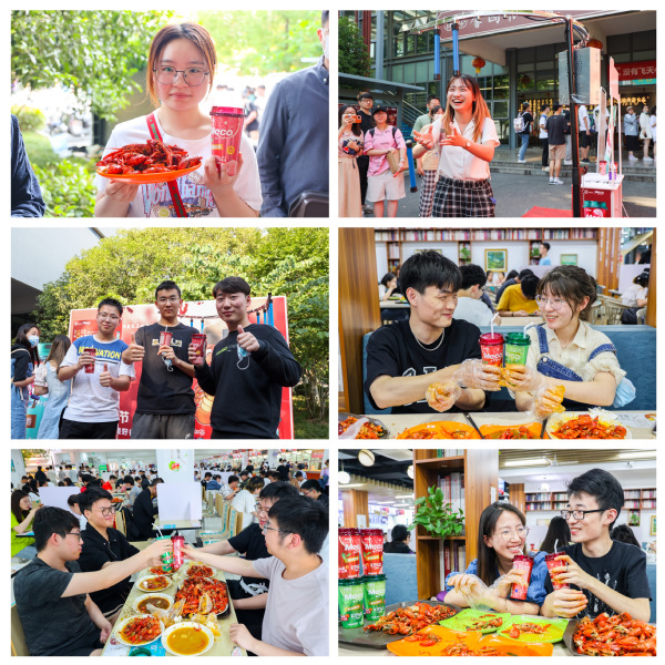 “加麻,加辣,加一份回忆”;“荟萃楼,凌云路,梧桐碧连天”;“膳堂内,龙虾红,同窗共鋿宴”;“在南航,飞天小龙虾,不会缺席任何一个毕业季。”各色毕业标语将食堂布置一新;在龙虾售卖现场,还专门设置了福利活动,玩“眼疾手快”游戏,赢饮品和免费龙虾券。大家零距离互动,在品尝美食的同时享受轻松愉悦的校园生活,让南航校园青春洋溢。