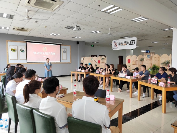 为进一步提升员工食品安全意识,督促员工将安全知识运用到实际工作中,6月21日,饮食服务中心在将军路校区和园餐厅三楼组织开展了一场食品安全知识竞赛,三校区8支队伍共24人参加比赛。中心主任陈杰、副主任刘伟、王春平、纪昀及一线员工共50余人到场观摩。