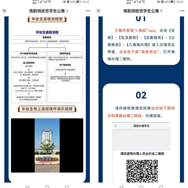 今年毕业季,为推进我校学生公寓信息化建设,逐步实现公寓线上管理全覆盖,切实提升公寓服务质量,公寓服务中心针对2018级全体本科毕业生首次推出线上退宿、扫码离宿新流程,通过一网通办、全程网办等方式,让数据多“跑路”,学生少“跑腿”,为全体毕业生提供便利。