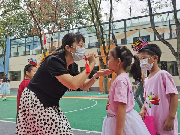 “朱砂开智”:热情亲切的老师们已经在早早的等候,迎接一张张清澈灿烂的笑容,认真而郑重的在孩子额头用红色的朱砂点上红痣,意味孩子从入园的第一天开始,能开启智慧,勤奋好学。