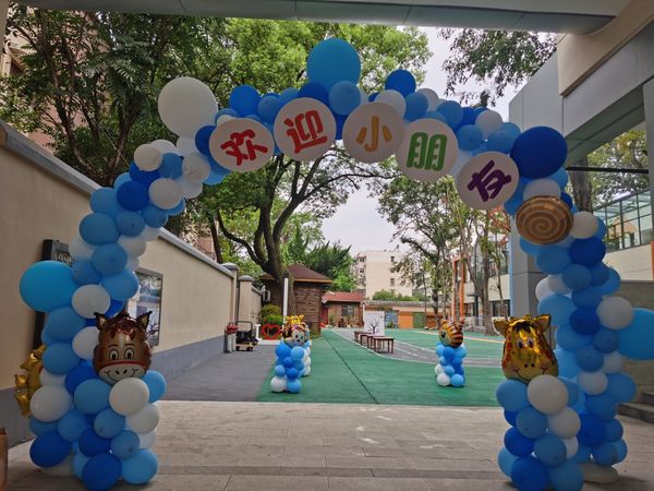 “入园有礼”:穿过蓝白相间、寓意虎虎生威的气球拱门,老师们为孩子带上具有正能量的头饰:“梦想起航”“一起向未来”“创意无限”“强国有我”“勇往直前”“童心向党”,老师把美好的祝福和对孩子的希望都融入了这个精心定制的专属发饰中。