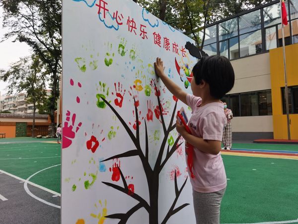 “成长树手印画”:孩子在“成长树”上印下自己成长的手印,开启梦想的航船,希望孩子们在新园舍里,在老师亲切的问候和温暖的祝福声中茁壮成长。