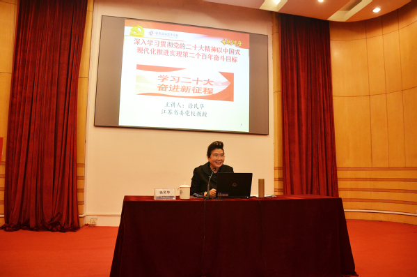 开班仪式结束后,中共江苏省委党校二级教授徐民华为大家讲授了培训班第一课。徐民华以《深入学习贯彻党的二十大精神,以中国式现代化推进实现第二个百年奋斗目标》为题,从党的二十大报告的框架结构引入,重点讲述了充分认识新时代十年伟大变革的重大意义、牢牢把握习近平新时代中国特色社会主义思想的立场观点方法、牢牢把握新时代新征程上以中国式现代化推进中华民族伟大复兴的使命任务以及深刻领悟“两个确立”的决定性意义,最后以习近平总书记向全党提出的牢记“五个必由之路”和党中央向全党发出的号召收尾,作了一场十分精彩的二十大精神学习辅导报告。