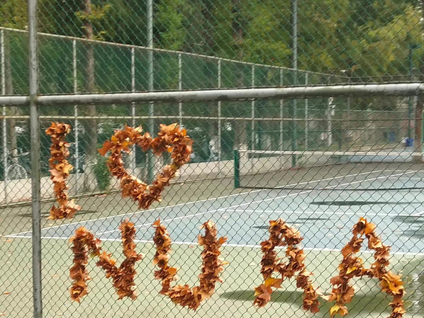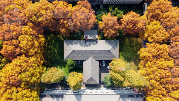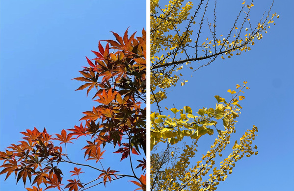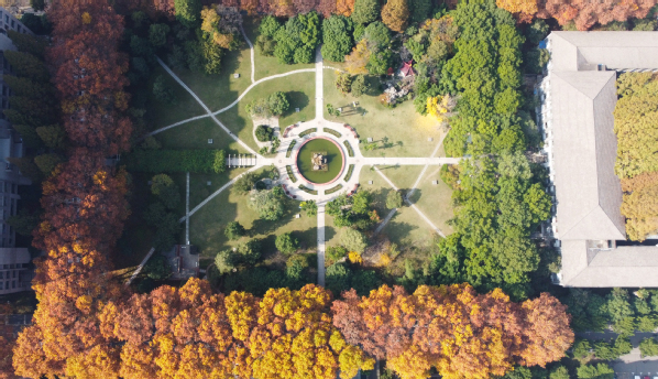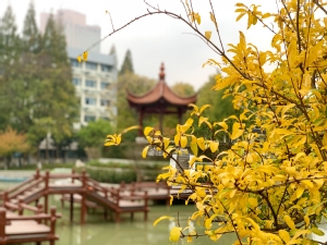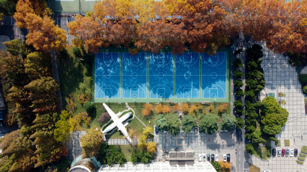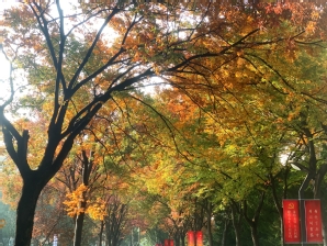 体育馆旁的榉树仿佛在建造秋日隧道,漫步其间,忽的抬头,就能被层层叠叠的叶片所吸引,橘红橙黄浅绿的融合像无意间打翻的调色盘,可谓“晓来谁染霜林醉,总是秋来绘”。
