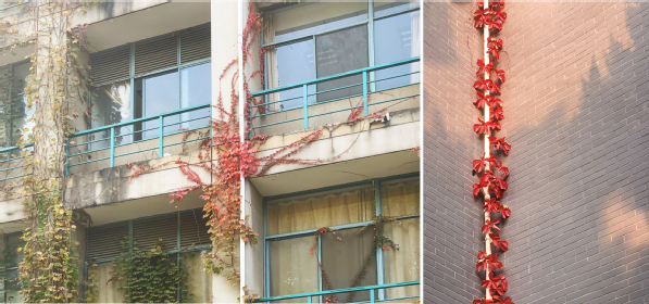 由中山东路经过,便能看见一墙的爬山虎顺着继教院楼宇的立柱攀缘着向上,有的叶片极为明艳,像是被秋风惹红了脸。