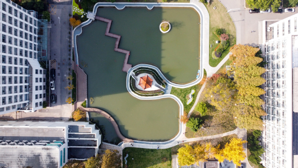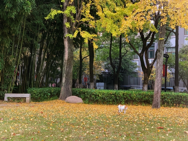 御园的银杏叶洒落在草坪上,淘气的小猫像找到了“游乐场”,时而打滚,时而梳理毛发,累了便蜷在落叶丛里,好不惬意。