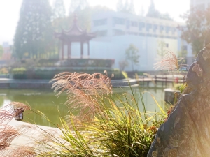 东华湖畔,太庙井旁。花叶芒探出穗,好似在秋风里轻盈跳跃。