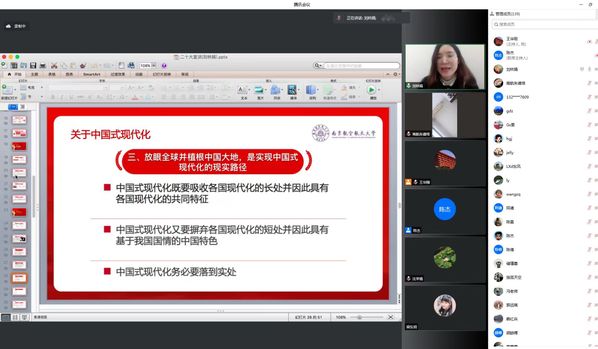 为深入学习贯彻党的二十大精神,切实把广大干部群众的思想和行动统一到会议精神上来,学校组织了宣讲团分赴各二级党委开展宣讲活动。12月16日下午,学校马克思主义学院刘林娟老师为后勤集团党委和离退休党工委作党的二十大精神专题辅导报告。因疫情防控需要,报告会以线上会议的形式进行,近150名党员参加学习。后勤集团党委副书记侯贵菊主持会议。