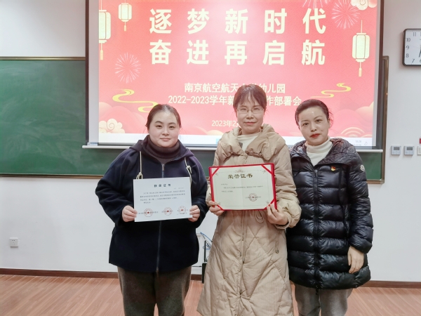 李民惠、陈慧云为在2022年度论文、案例中获奖的老师颁发奖状并送上祝福。他们是幼儿园的榜样与典范,彰显着务实笃行、敬业奉献的卓越风姿,同时也勉励着全体教职工在新学期里再接再厉、勇攀高峰。
