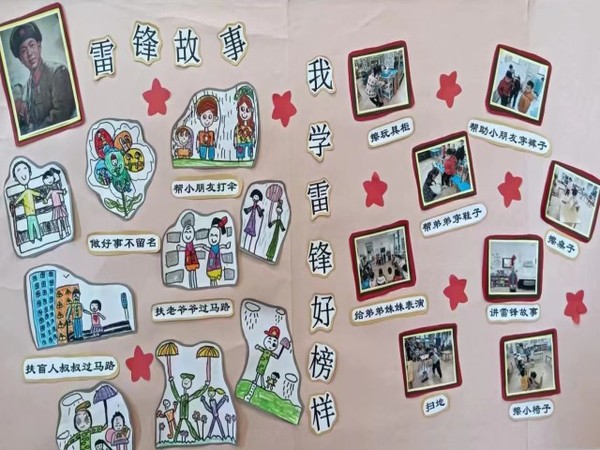 在老师的带领下,孩子们充分发挥自己的本领手绘了雷锋做好事的图画,用绘画的形式表现了雷锋在我们每个人的身边,为了让更多人的人加入到学雷锋的队伍中来,老师和幼儿还通过宣传展板号召叔叔阿姨们向雷锋学习,弘扬雷锋精神,树立文明新风。