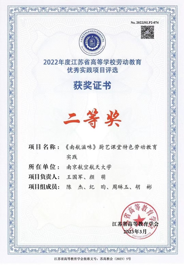 3月17日,“南航滋味”厨艺课堂特色劳动教育实践项目,通过2022年度江苏省高等学校劳动教育优秀实践项目评选,荣获二等奖。