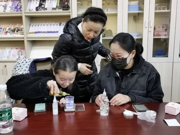 活动中,老师们尝试将精油滴在手腕处,细细品味不同精油的味道,在感受精油芳香的同时,也有一种身心放松的愉悦。接着,大家按照胡老师指导的制作护手霜的步骤,从倒入60毫升纯净水在器皿里开始,分别将乳化剂、保湿剂、橄榄油等按照一定的比例倒入水中,最后,再滴上几滴自己喜欢的精油,用小勺不停的搅拌直至粘稠状,放置5分钟左右后装入小礼盒里,整个制作过程,大家都非常认真地投入。看着原材料在自己手中变成了一盒细腻滋润的精油护手霜,清透的乳霜质地划过手部肌肤,似是春日的暖阳软软照拂,所有人的脸上都洋溢着幸福的微笑。