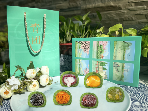 此次青团礼盒从口味到包装设计做了全面升级。在口味上,除了传统经典的蛋黄肉松馅儿、豆沙馅儿、黑芝麻馅儿以外,还加入了爆浆芒果馅儿、鲜花牛奶馅儿、茉莉青提馅儿等网红新品,咸甜兼具,六种不同口味,满足广大师生对美食的创新追求。