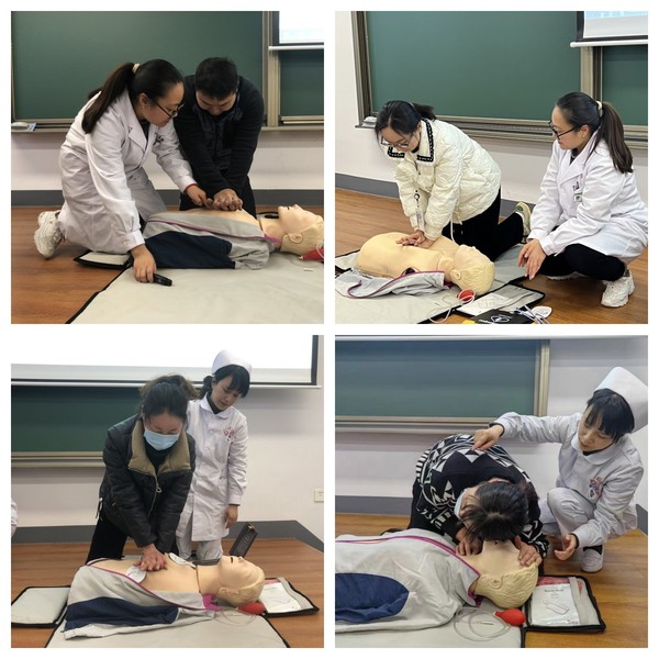 本次培训,邀请了校医院的医生、护士来向大家教授心肺复苏、自动体外除颤仪(AED)等急救知识。培训中通过视频、理论与技能实操相结合的方式,向大家详细讲述了掌握急救知识的重要性,重点讲解了“黄金4分钟”的急救原则、心肺复苏急救法等。校医院医生强调,实施心肺复苏急救法不光是要清楚流程、规范动作,还考验施救者的心理素质,具备遇事不慌,多人协作能力也很关键。