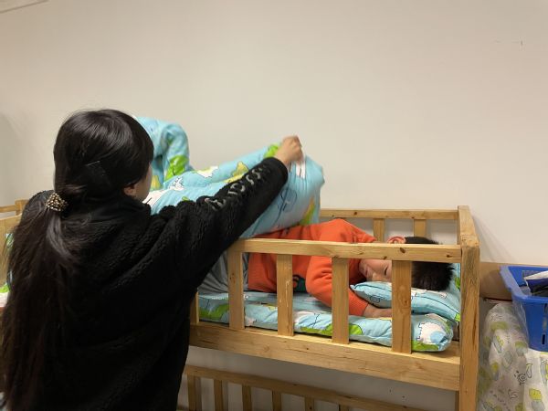 幼儿上床后,老师慢慢走在幼儿中间,用轻柔的声音带领幼儿结合中国传统节日念睡前古诗、儿歌、讲故事,轻拍幼儿的身体、抚摸额头、整理被褥,幼儿在老师妈妈的关爱中慢慢地进入梦乡。值班老师中途巡视幼儿的情况,帮助幼儿调整睡姿、细掖被角、关注体弱幼儿入睡状态,坐在还未睡着的幼儿身旁,引导他们尽快入睡。看着幼儿熟睡的脸庞,老师心里收获了满满的温暖和幸福。