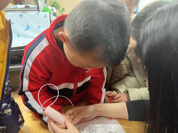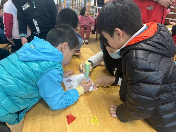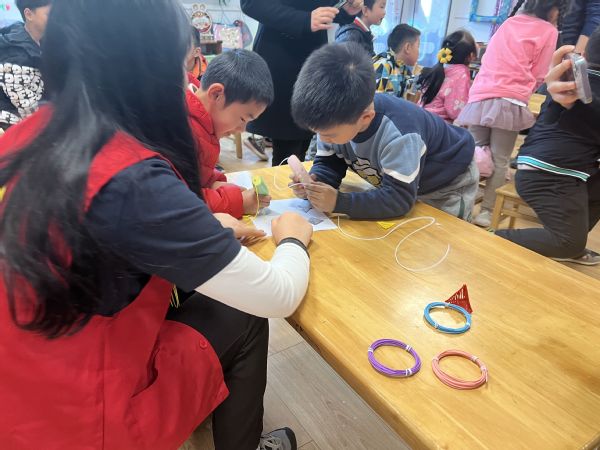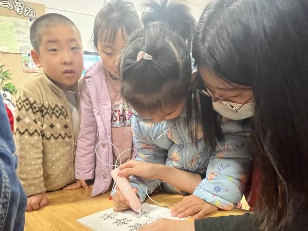 随后,材料加工工程系常务副主任林开杰带领大学生志愿者们走进大一班课堂,志愿者们用通俗易懂的话向幼儿介绍了关于3D打印的知识原理,刚抛出第一个问题,幼儿就争先恐后的分享了自己心中的3D打印。大学生志愿者用既浅显易懂又富有神秘色彩的话语向幼儿介绍了什么是3D打印,以及3D打印的应用领域,如航空航天、房屋建筑、生物医疗等。介绍结束后林老师和大学生志愿者们一同带领幼儿进行实践操作,他们拿起打印笔,一笔一划地描绘着,小小打印笔在幼儿的手中不停舞动,不一会各种生动灵活的小模型便呈现在大家面前。